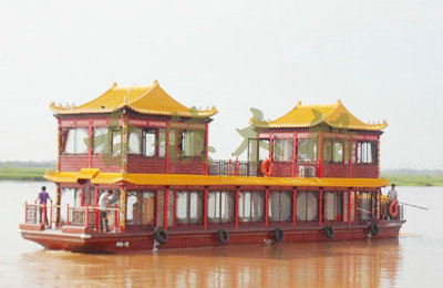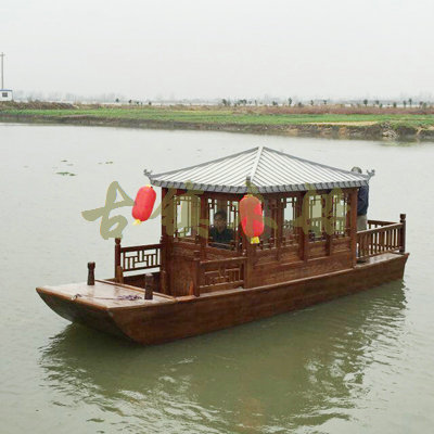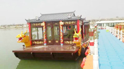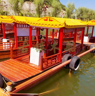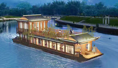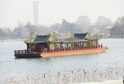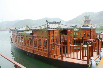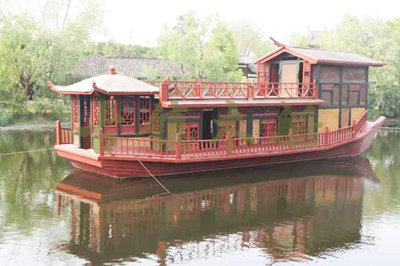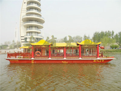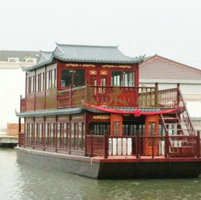 畫(huà)舫船就是裝飾古典華麗的游船,是"中國(guó)風(fēng)"的仿古游船,結(jié)合古典園林建筑,體現(xiàn)了中華文明的古典藝術(shù).畫(huà)舫船豪華而又古典,船上的建筑按照中國(guó)古代建筑里的亭臺(tái)樓閣,建筑工藝之復(fù)雜,要求之嚴(yán)格,仿古畫(huà)舫游船的特點(diǎn)飛檐翹角、玲瓏精致的四角亭子逐漸成形,赫然立于船頭,美人靠、盤龍柱子、彩畫(huà)……龍柱上的浮雕盤龍和祥云一層扣著一層,層層錯(cuò)落有致,雕刻精細(xì)到盤龍身上的每一個(gè)鱗片都細(xì)細(xì)可數(shù),古代皇家標(biāo)志性元素,在畫(huà)舫船上體現(xiàn)的淋漓盡致。除了雕刻、花窗,整條船還有一個(gè)看點(diǎn),那就是弧線優(yōu)美、高高翹起的船尾。游船并不大,長(zhǎng)約10米、寬3米,但是整體看起來(lái)堪稱一件藝術(shù)品。船尾的雕花欄桿與船艙、船頭的雕刻遙相呼應(yīng),船身四周貼著浮雕祥云,給整條船增添了富貴、華麗的氣質(zhì)。